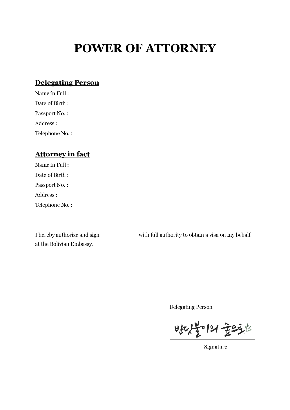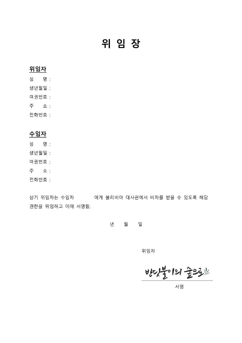 대신 볼리비아 비자발급 시 필요한 위임장 양식 (한글+영문버젼)