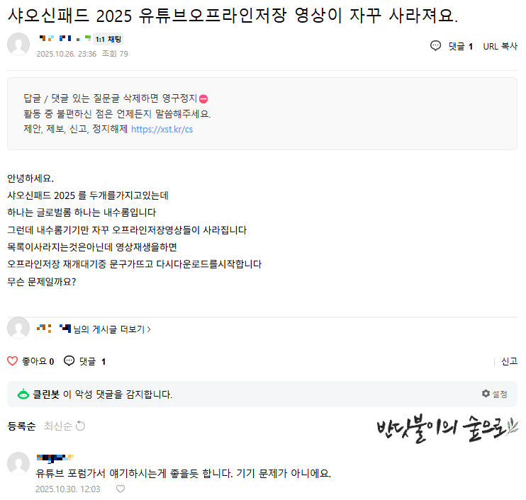 - 증상 : 유튜브 오프라인 저장 동영상이 자꾸 자동으로 삭제됨.