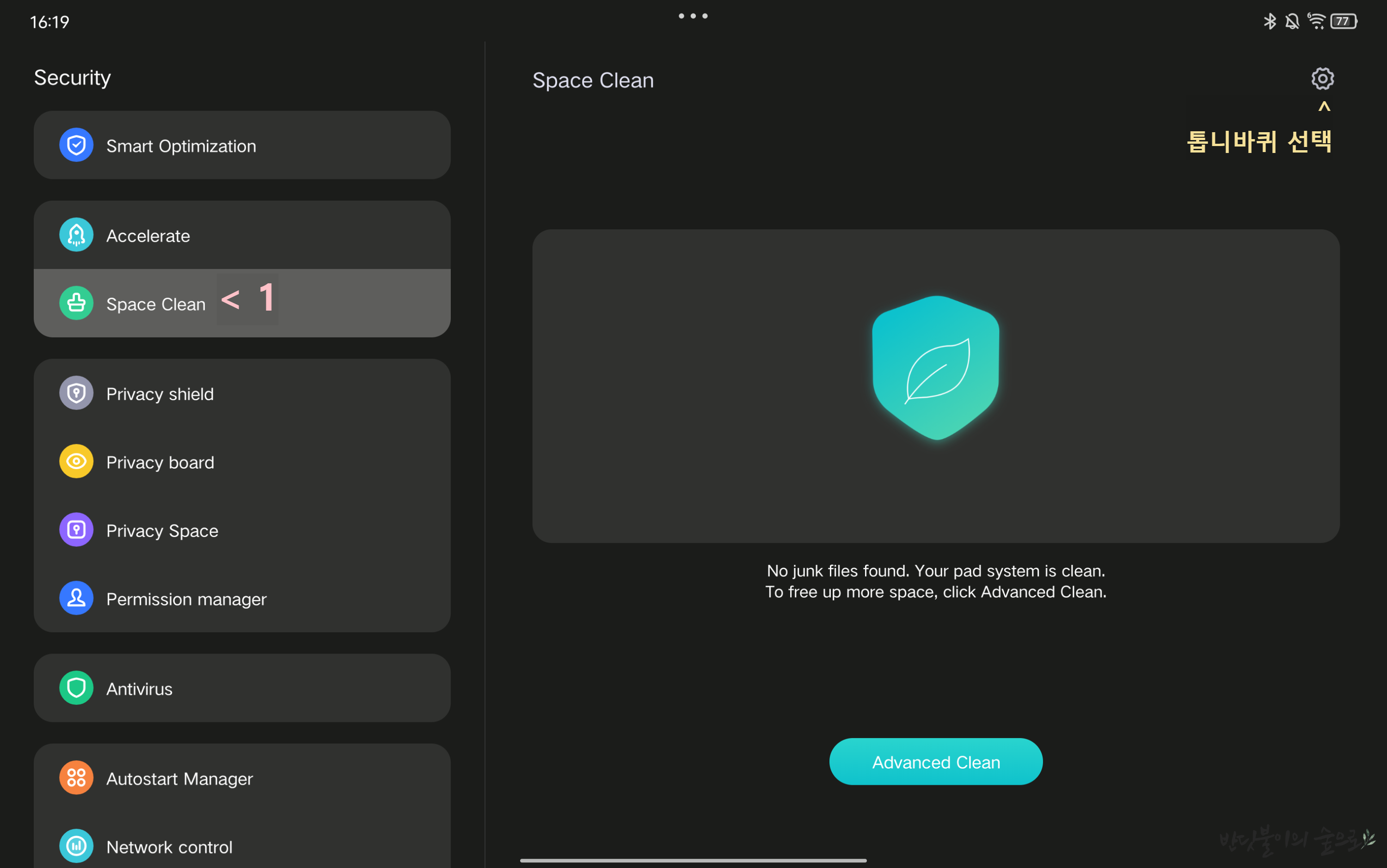 2-1. 왼쪽 메뉴 첫번째 Smart Optimization > Space Clean 선택 > 사진 2-2와 같은 화면이 뜸