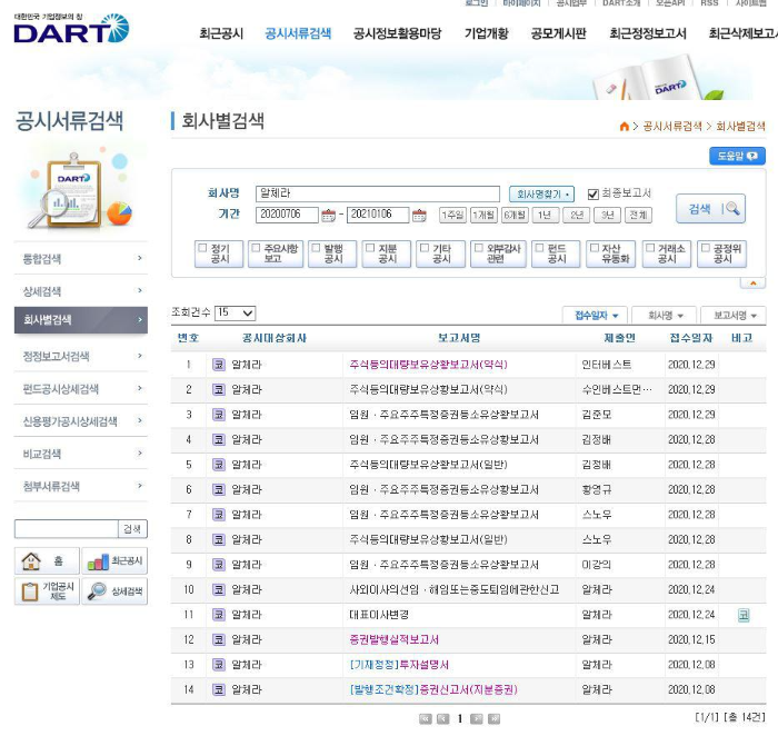 회사별 검색에서 회사명에 알체라를 넣으면 아래 사진처럼 검색이 됩니다.